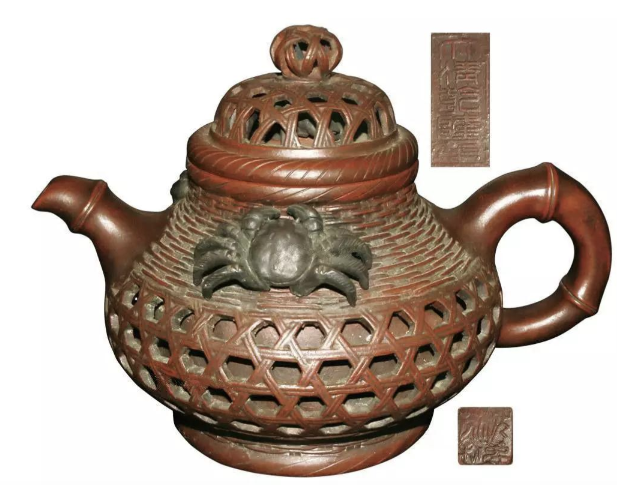 何挺初在創(chuàng)造“蟹簍壺”時使用了雕鎪鏤空的本領(lǐng)。把壺身雕成竹編的魚簍,且發(fā)揚自己捏塑的專長,在壺身一側(cè)和壺關(guān)上各塑一只匍匐的螃蟹,在化妝動作壺蓋的“魚簍罩”時,使用鏤白本領(lǐng)將其鏤空,使之酷似用竹條編成的罩子,進而博得了較好的藝術(shù)效驗。