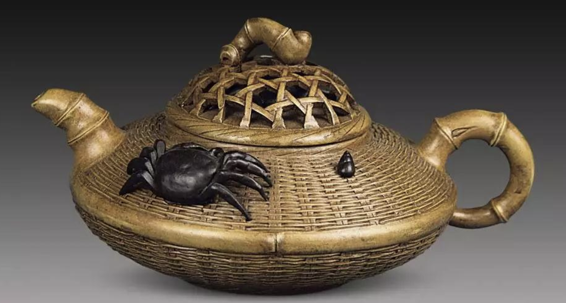 此壺善于雕刻化妝,善創(chuàng)新樣,塑鏤兼長,構(gòu)想之脫俗,設色之精巧,在紫砂史上是少睹的。壺身一半呈竹簍紋雕刻,一半采取花器創(chuàng)造本領(lǐng),頸肩以荷葉輔之,壺鈕是鏤空成型的圓,在編排有序的簍外,三只螃蟹和一只海螺分離而立,格形狀象、真切。