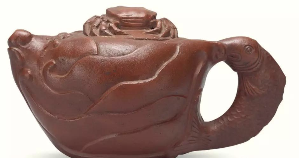 壺身似層層波浪,翻騰洶洶,動感實腳,壺鈕、壺蓋以螃蟹飾之,壺把一條鯉魚現(xiàn)個中,整把壺貫串完美無缺,局面靈巧。