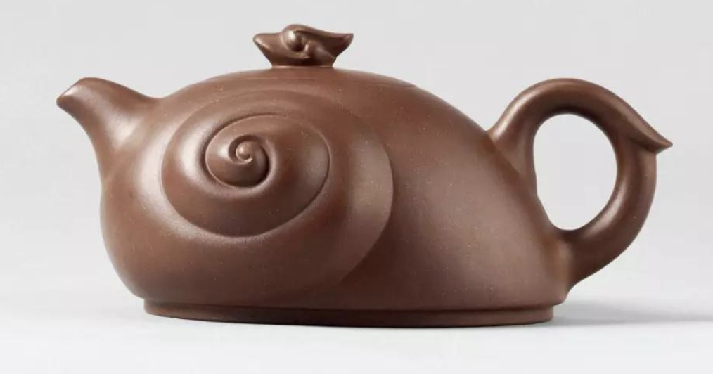 使用妥當,沒有宜過于花俊是此壺得特性。壺身以水鳶象形安排,鈕、把為其頭尾,安排局面靈巧,壺身一側(cè)為田螺,一側(cè)為螃蟹,停止而立。完全歪斜,呈動向之勢,好像秋日一副蟹胖豐產(chǎn)的故鄉(xiāng)繪卷。
