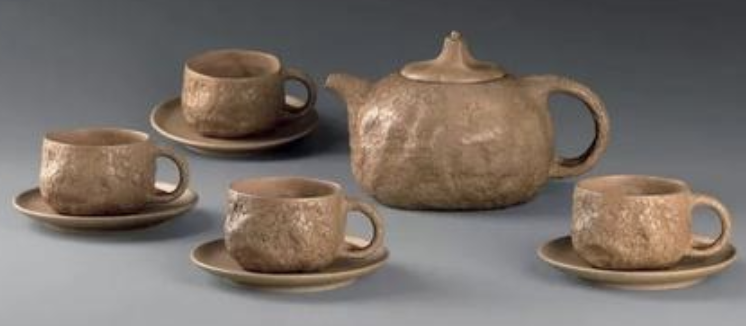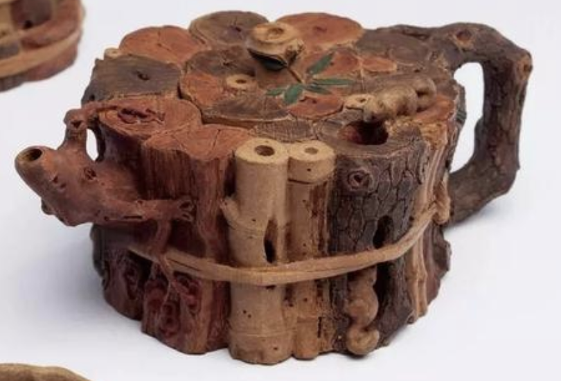 這一套茶具創造的閉頭是供春壺的身筒和杯子的身筒,由于供春壺壺身是“樹癭”,也即是大樹虬枝上的樹瘤,有凹有凸。樹癭紋路要亂而沒有散,完全效驗又央求骨血勻和、精力豐滿,藝術作風協調一致。